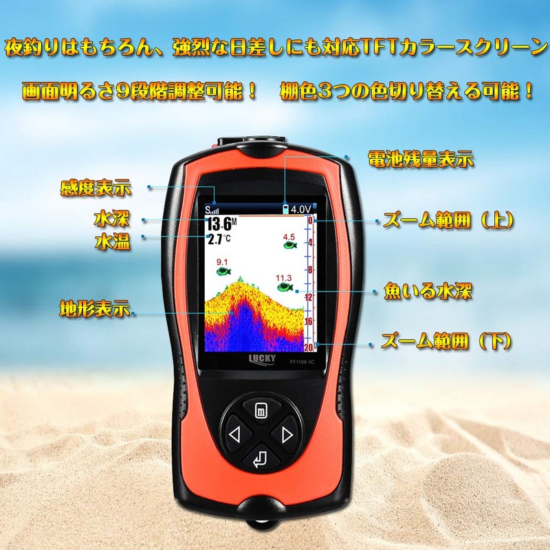 - Fish group detector power supply: 3.7V lithium battery Search fish can be used continuously for over 6 hours on a full charge. Includes a USB cable for charging, AC adapter, and car USB charging plug, so you can charge your gottan detector anytime, anywhere. The Luckylaker FF1108-CT Fishfinder is compact and easy to carry, so it can be easily stored in your bag. You can easily detect fish and enjoy fishing at your first fishing area when traveling or camping. 12 month warranty and after-sales service team support in Japanese