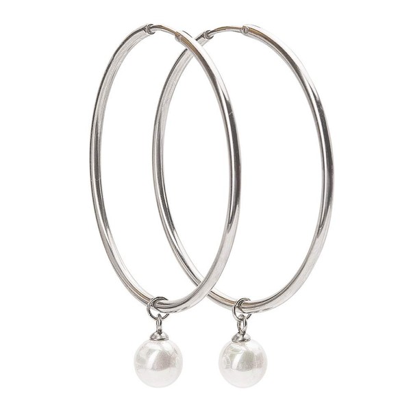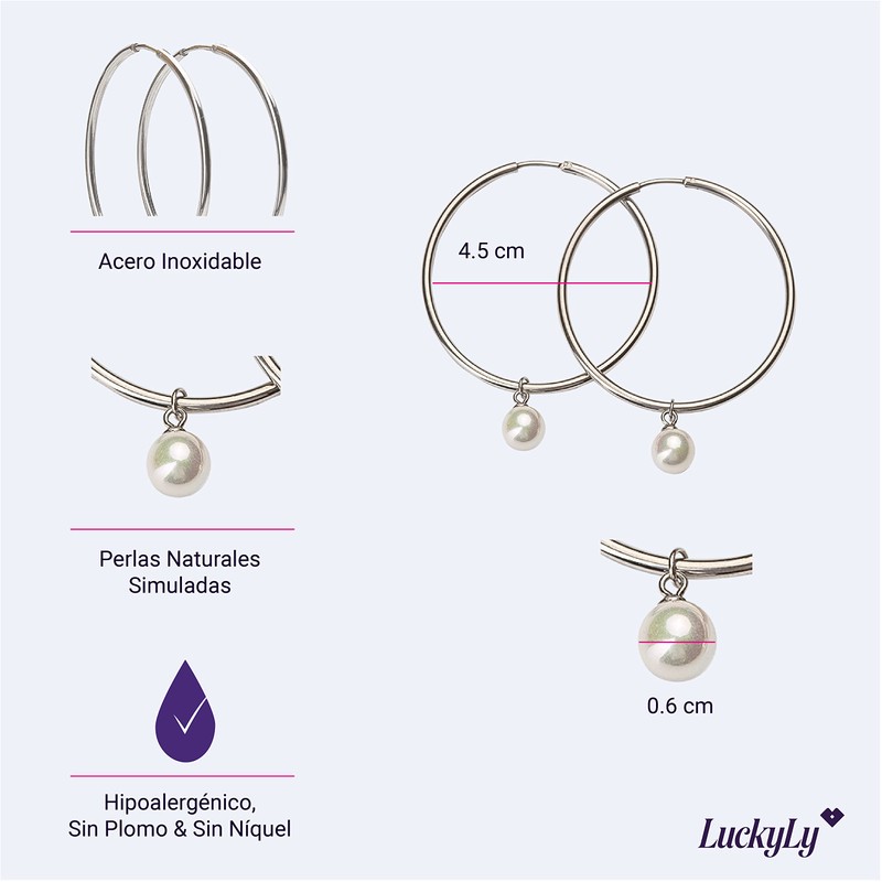 - MEDIDAS: Diámetro arracadas: 4.5cm. Largo: 4.5cm. Perla (diámetro): 0.6cm. Estos aretes para mujer perlas le quedarán cómodamente a la mayoría de las mujeres. Son tan versátiles como los quieras ocupar, para salir de noche, o casual para el diario. Las arracadas acero inoxidable mujer plata Adele ayudarán a que tus outfits sean únicos.