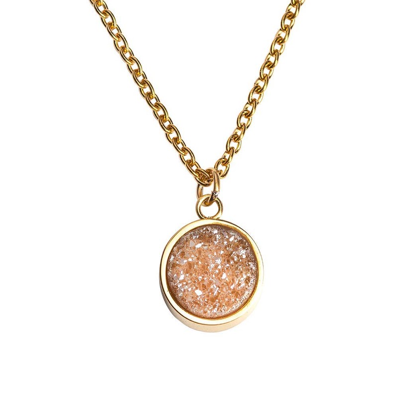 - DISEÑO ESPECTACULAR: El collar de mujer con piedras preciosas Anya es de los collares acero inoxidable mujer más especiales. Tiene baño de oro 18k y está compuesto por una cadena con dije de piedra preciosa drusa de cuarzo (drusy en inglés) color champaña. Es uno de los collares mujer cuarzo con dije más sencillos, pero a la vez elegantes. Estos collares oro 18k son parte de la colección de joyería para mujer inspirada en la elegancia, además son de los regalos para mujer originales ideales.