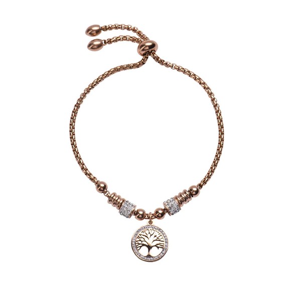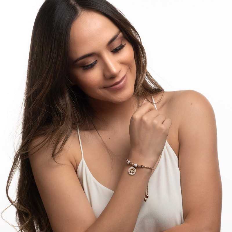 La pulsera para mujer con dije de árbol de la vida rodeado con zirconia cúbica es de buena suerte, representa la fuerza y positivismo. Es uno de los brazaletes mujer acero inoxidable más bonitos, es una cadena con baño de oro rosa 18k y tiene un dije más otros detalles brillantes. Es una pulsera oro rosa 18k espectacular y de las pulseras mujer acero inoxidable más especiales. Definitivamente de los regalos para mujer cumpleaños perfectos y regalos mamá y abuelita ideales.