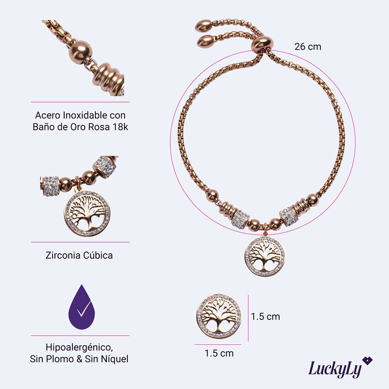 - MATERIALES DE EXCELENTE CALIDAD: Acero inoxidable con baño de oro rosa 18k y zirconia cúbica. Utilizamos los más altos estándares de calidad para todos los materiales ocupados en esta pulsera mujer con dije de árbol de la vida. Hipoalergénico, Sin Plomo & Sin Níquel.