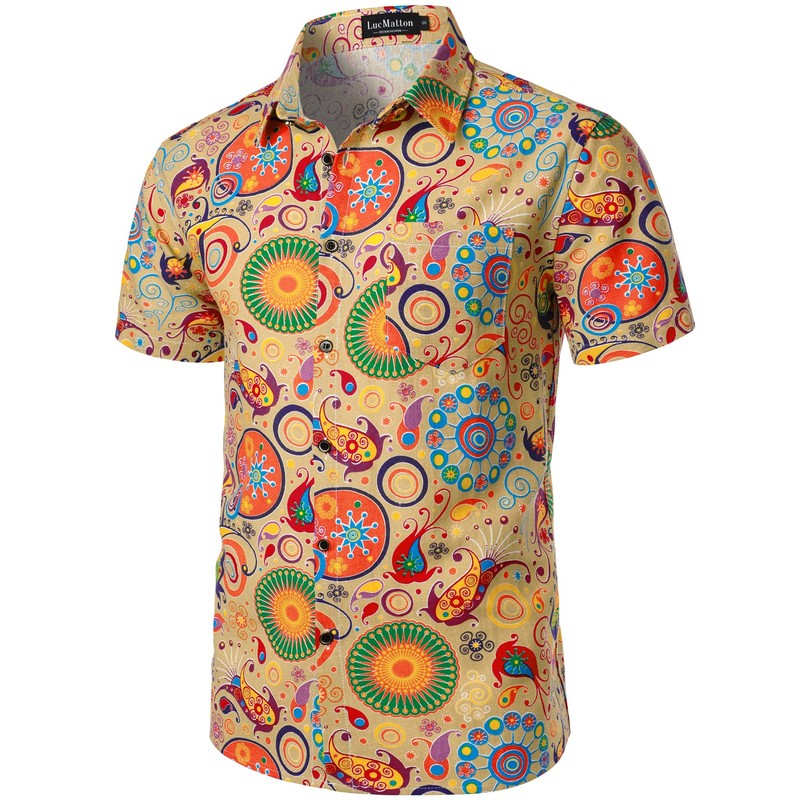 LucMatton Men's Short-Sleeved Button-Down Hawaiian Shirts with Traditional Pattern Print, Cotton Linen, khaki