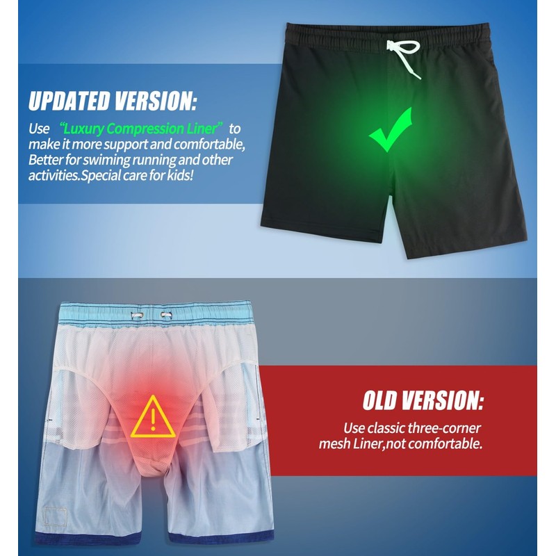 - COMFORTABLE BOXER BRIEF LINER - Super soft smooth material for the built-in compression liner, full size boxer lining is not too tight,considering your kids need some give in the growing period.This swimming trunks will allow your boys to enjoy the beach,pool & water park without chafing burn,comfortable & supportive.Also it's not only a bathing suit,but also a nice piece for playing, running, training, workout.