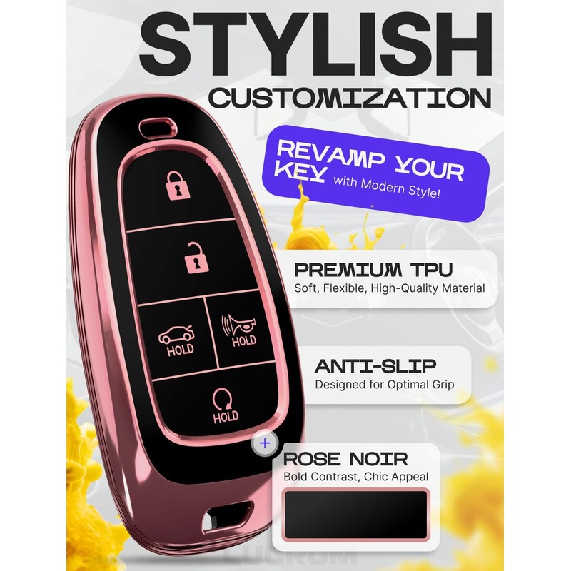 Lucrum Compatible with Hyundai Sonata Key Fob Cover & Leather Keychain - Keyfob Case for Santa Fe Tucson Ioniq 5 Palisade (2019-2023) - Pink and Black