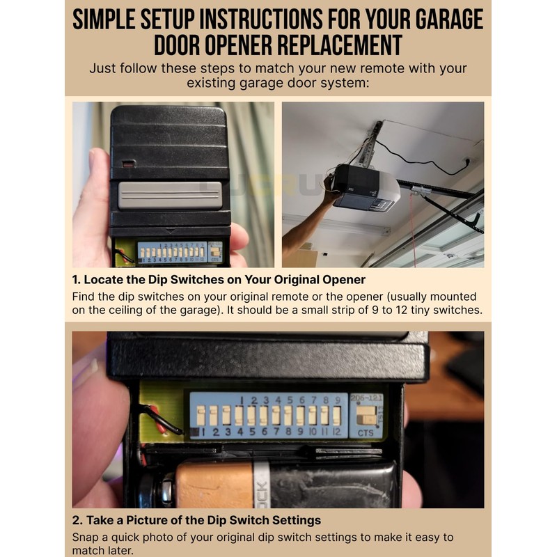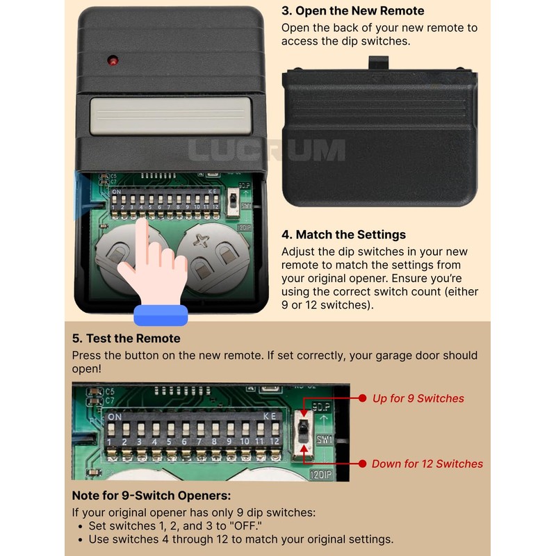 - Simple Setup: Easy to program by matching the dip switch settings of your existing opener. Compatible with 9/12 dip switches for smooth operation. Note: Not compatible with 3-state dip switches (+, 0, -)
