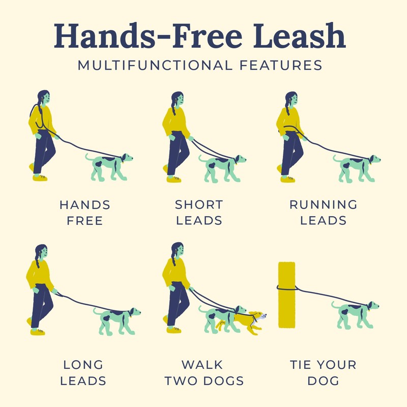• One Rope, Six Ways: This leash offers a variety of uses, including hands-free, short leads, long leads, running leads, walking two dogs, or keeping your dog secure