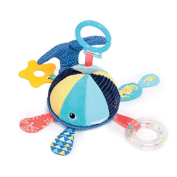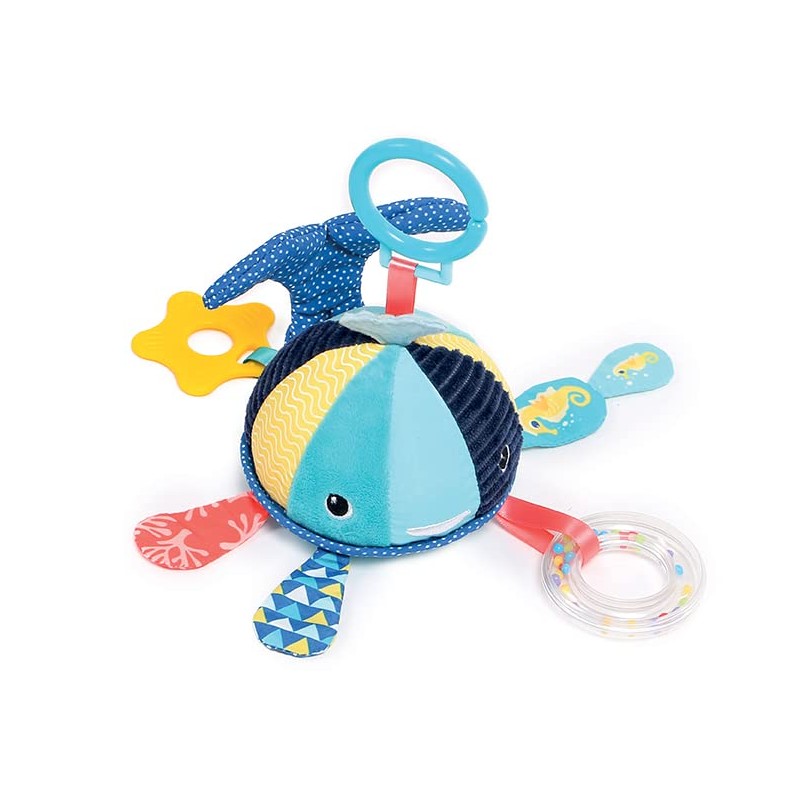• Game: This hanging activity whale is an experience toy that you can hang anywhere. The whale and its hanging activities will entertain the baby and stimulate the senses and fine motor skills and grip.
