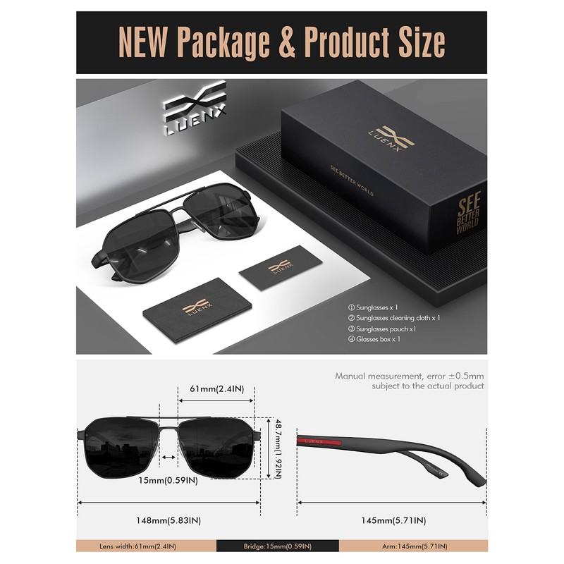 • 30 DAY RETURN ▶ First Choice as A Gift.Square Aviator Style for Men.Good for Driving & All Out Door Activities for all Day;Sturdy without being too heavy;Stylish and comfortable;Most economical and high quality sun blocking shades with elegant Glasses Accessories.We will help you slove all the issues,please let us know first.Why not to have a try?Get LUENX'S Sunglasses Now;