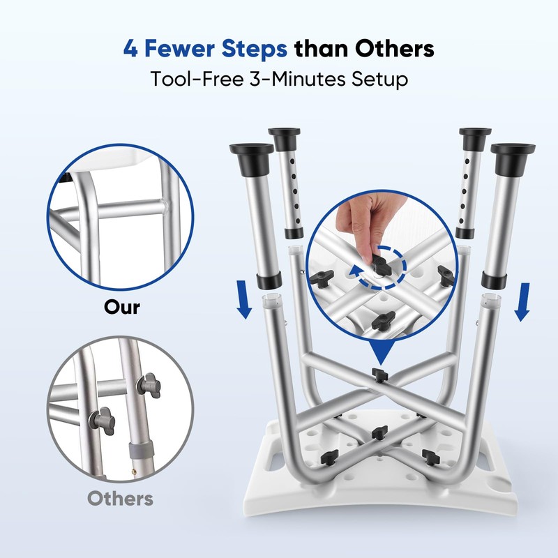 - 【3-Minute Assembly, No Tools Required】Assemble this shower chair for inside tub in just 3 minutes with zero tools! Unlike most shower benche or shower seat, it features 4 fewer screws for faster, easier setup. The included step-by-step manual and clear installation labels ensure a smooth, hassle-free process. Enjoy convenience right out of the box—ideal for users who want quick and reliable assembly.