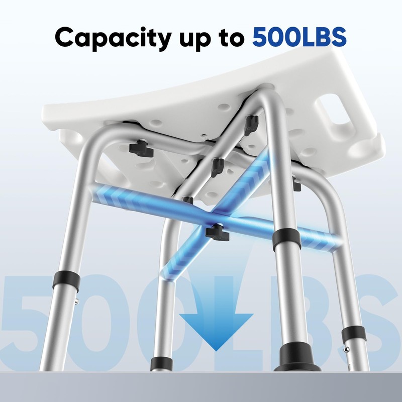 - 【500LBS Capacity, Stable Shower Chair】Built with reinforced cross-braces and angled legs, this shower seat offers exceptional stability and support. Non-slip feet enhance security, even in wet environments. The reinforced frame of this shower stool for inside shower ensures no bending or slipping, providing you with the confidence to bathe independently and comfortably every time.