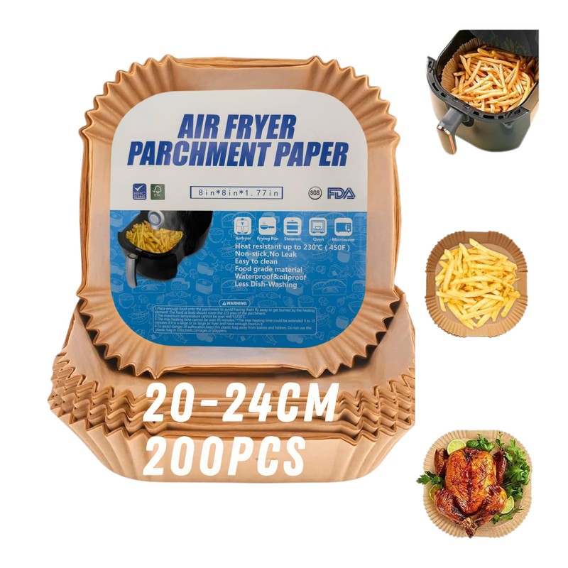 - Luftfritteuse-Papier, 20 cm x 20 cm x 4,5 cm, Luftfritteuseformen, Airfryer-Papier für gesundes Kochen, quadratische Form, kompakte Größe. Hält Temperaturen von bis zu 230 Grad Celsius stand und beeinträchtigt nicht den Geschmack von Lebensmitteln.