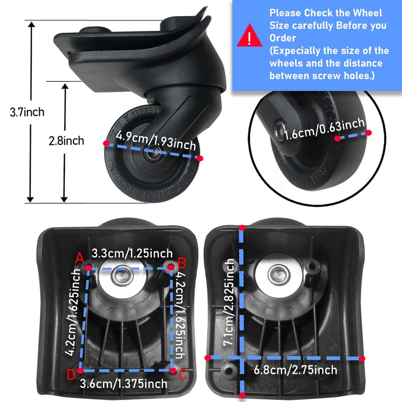 - [Size Detail] The highest point of the luggage replacement wheels from the ground is 3.7". The diameter and width of the wheels are 1.93" and 0.63" respectively. Please also confirm the distances from left to right: 2.75", the vertical distance is 2.825"