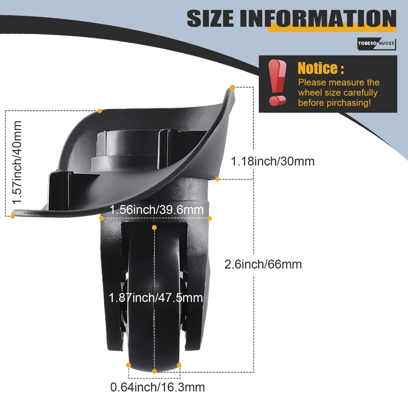 - Compatibility: these luggage wheels are not universal. Please compare the shape, structure and dimensions of your original wheels with our suitcase replacement wheels before purchasing. Please note the 2nd Product image.If your luggage wheel does not match the picture, the wheel will not fit