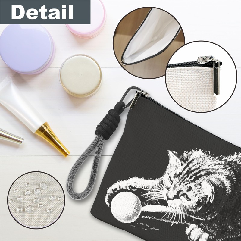 luixd Gothic Make Up Bag, Cosmetic Bag With Hand Strap - Hand Drawn Cat Playing - Lined Toiletry Bag - Travel Pouch, Black Organizer With Zipper, Women Essentials & Accessories - A15
