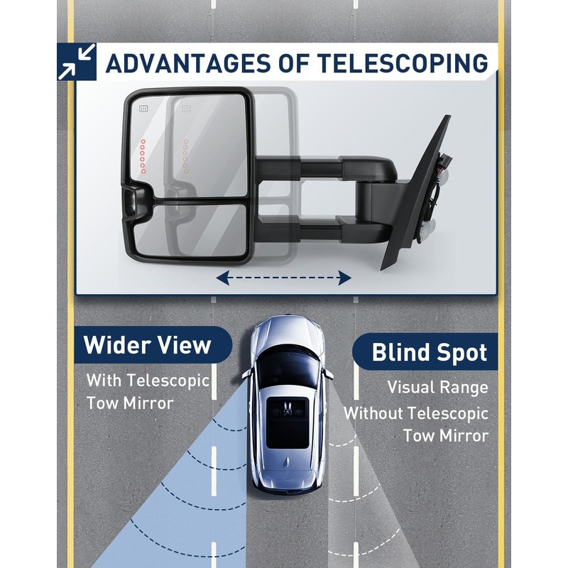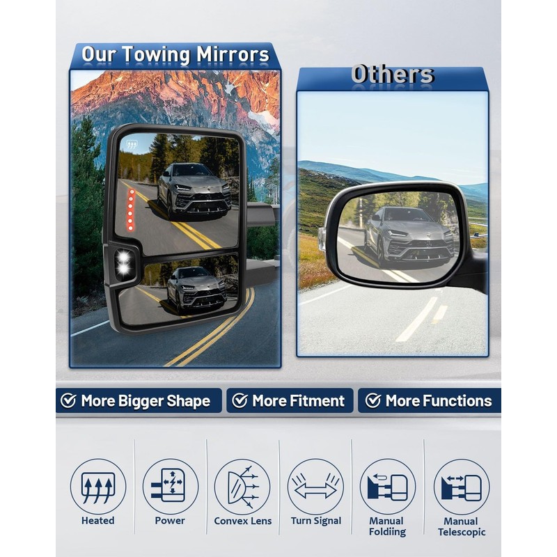 - Product Features: Tow Mirrors Power Adjusted,Heated,LED Turn Signal Light,Width Light,with Black Carbon Fiber Cap Housing,Manual Telescoping and Folding