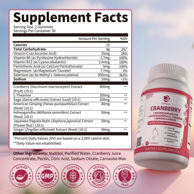 - 14-in-1 Daily Support for Women: More than typical cranberry gummies for women, this formula features cranberry extract (300mg), D-Mannose, Magnesium, B6, B12, Pantothenic Acid, Selenium, Vitamin C, L-Theanine, Ginseng, Ashwagandha, Sage, Rutin, and Ginger to support overall wellness