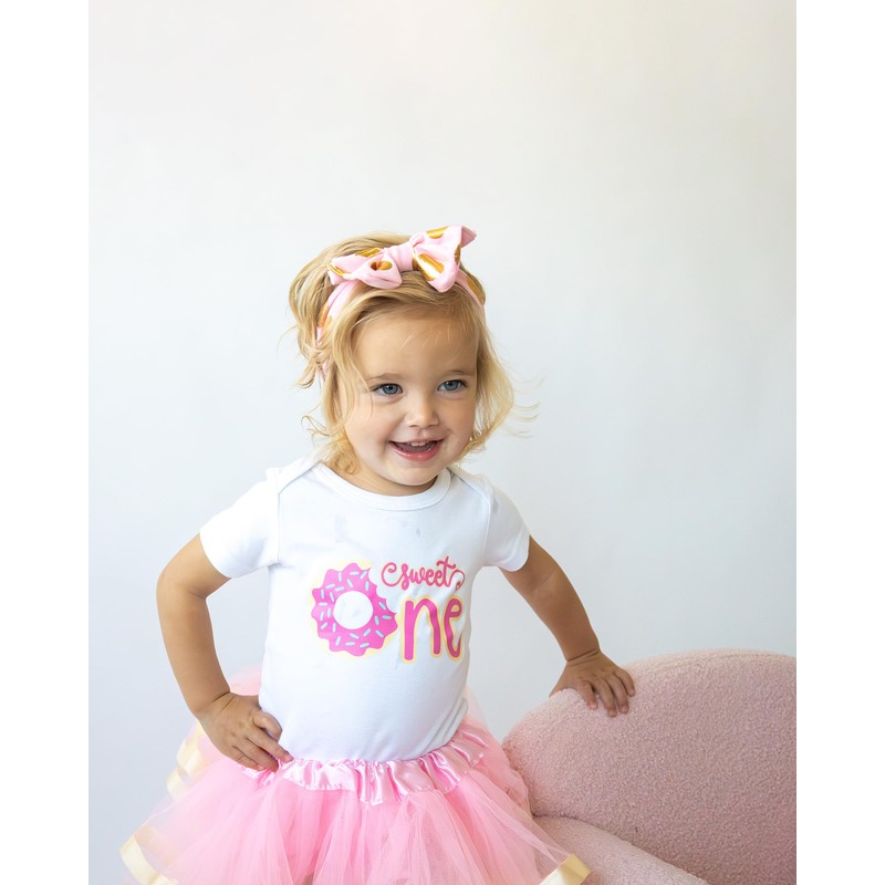 - PACKAGE CONTENTS - You will receive a sweet one donut birthday onesie with a cute pink/gold bow tie headband, and a pink satin trimmed tutu for your special one year old girl.