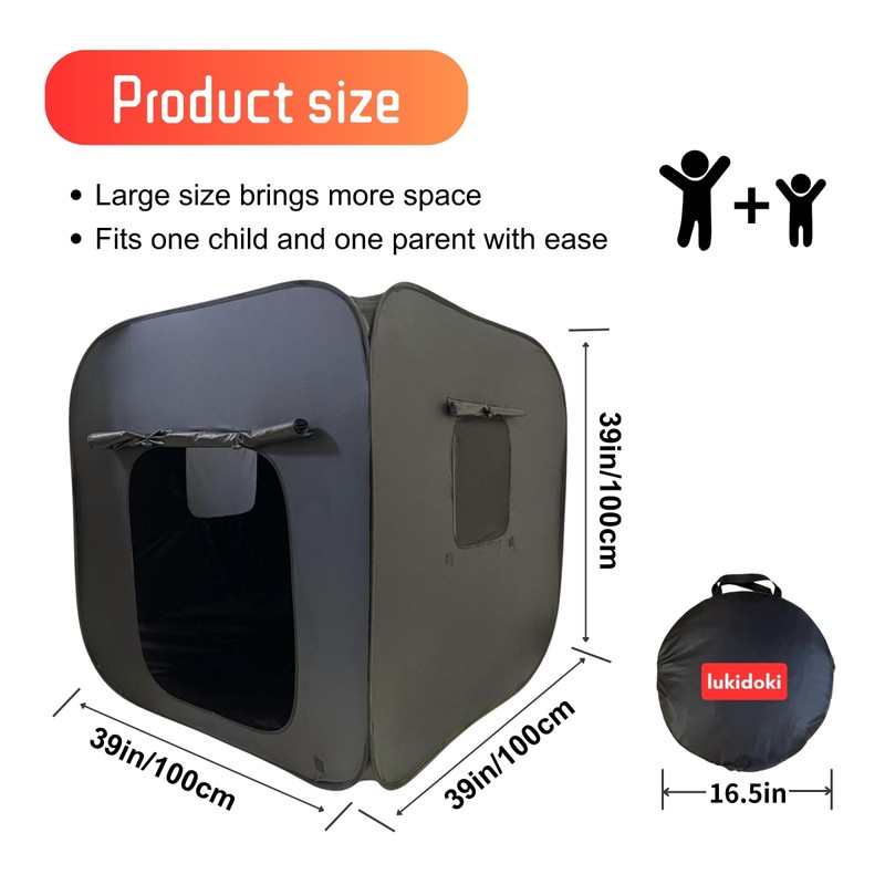 - 【Effortless Setup and Portability】 — The lukidoki Portable Sensory Tent features a simple pop-up design for quick setup in seconds. Providing a 39x39x39 inches peaceful hiding place, it folds effortlessly into a 16.5-inch diameter storage bag, weighing a mere 3 pounds. Compact and easy to carry, it's perfect for home or classroom use without occupying much space.