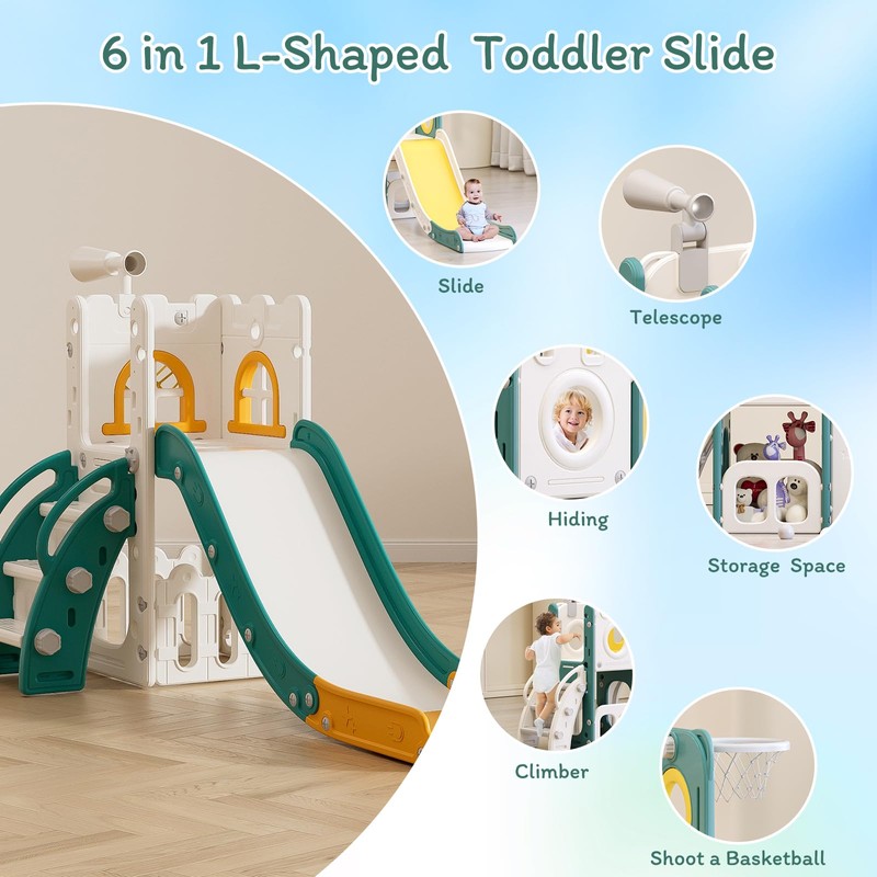 LulliSpace 6 in 1 Toddler Slide,Kids Climber Slider for Indoor Outdoor Playground with Basketball Hoop,Storage and Telescope,L Shaped Slide for Toddler Climber Playset
