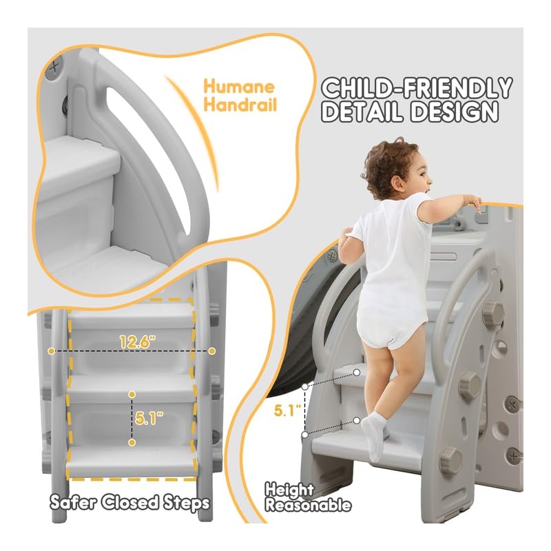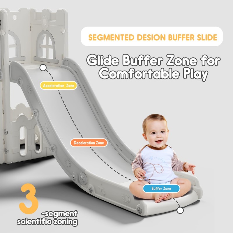 - 3.Smart Slide Design The kids slide features acceleration zone, deceleration zone, and buffer zone—for a smooth and controlled ride. The enclosed staircase with handrails prevents children from falling down, while the wide base and storage space keep toys organized. No more unstable slides—this design ensures safe, confident play for toddlers.