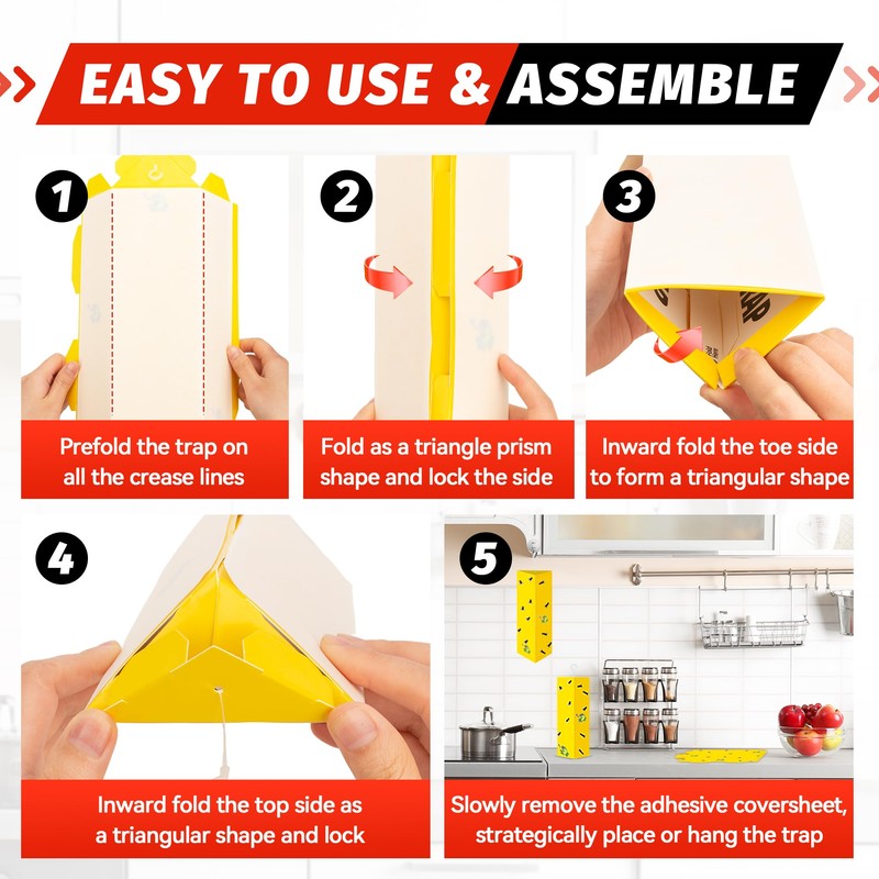 - USER FRIENDLY DESIGN: Our flea traps are easy to set up. These sticky traps come ready to use with no mess. Simply peel off the protective cover, fold them into a triangular shape and place them strategically in high infestation areas, making pest control a breeze.
