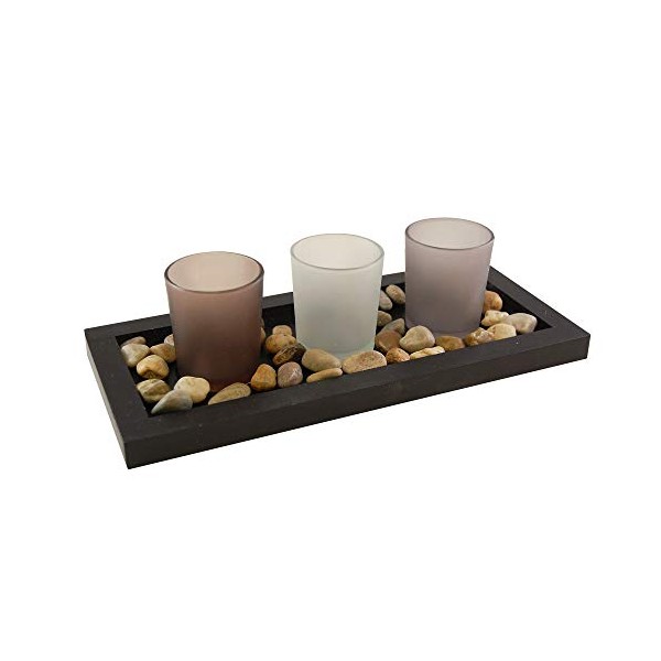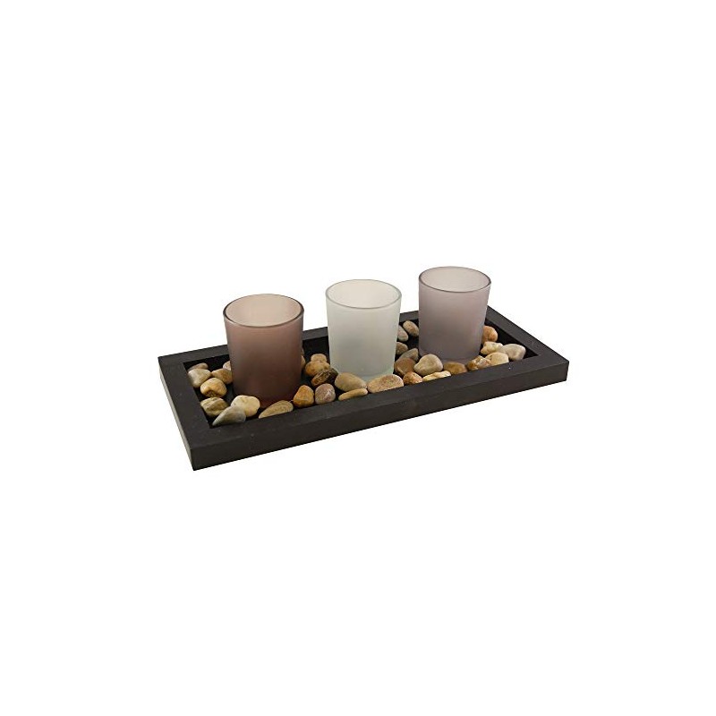 - Included: 1 Wooden Tray, 3 Glass Candleholders and Smooth Pebbles