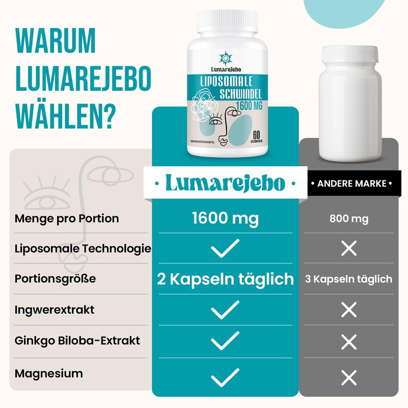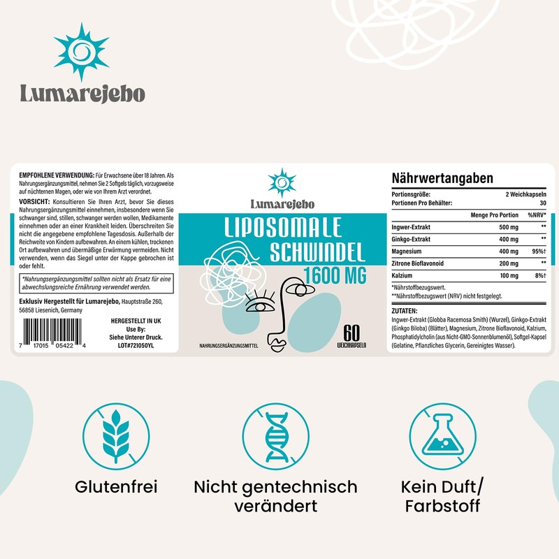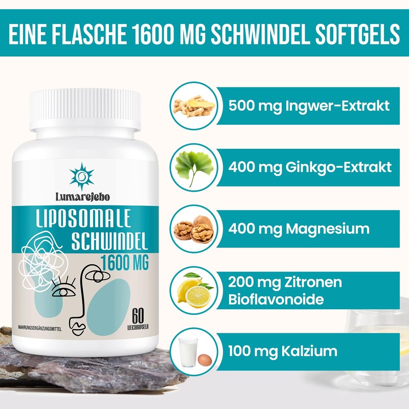 Lumarejebo Liposomale Schwindel Softgels 1600mg, 5-in-1 Premium Formel mit Ginkgo & Ingwer, Ideal f1r Unterwegs oder Lange Reisen, Nat1rliche L?sung, 60 St1ck (1er Pack)