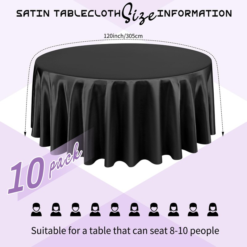 - Package List: You will get 10 packs black satin tablecloth.The size of satin table covers are 120 inch/305 cm, which is large enough to decorate a table that can accommodate 10-12 persons.The tablecloth size is usually larger than your table size. Please measure your table size before buying.