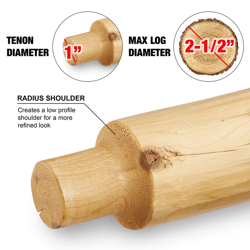 The Lumberjack Tools Home tenon cutters are ergonomically designed and feature a Radius Shoulder profile (low profile) that offers a more refined look. The tools are Safe, Fast & Easy to Use to use and the tenon cutter Works Like a Giant Pencil Sharpener. Build your own log beds, log railings, log fences, log tables, log chairs, log arbors, log benches & more! A 1/2" heavy duty drill is recommended for use (Specs: Pipe handle drill, single-speed, 450 RPM's or less). Tenon cutters are backed by Lumberjack Tools Lifetime . Home Tenon Cutters are die cast from automotive grade aluminum and feature dual blade technology to cut tenons quickly and efficiently. Accepts a log from 1-1/2" - 2-1/2" in diameter. Includes: 1" Tenon Cutter, (1) Set of Blades (Includes (2) blades, (2) button screws, (1) Allen wrench) & (1) Manual. Made in the USA