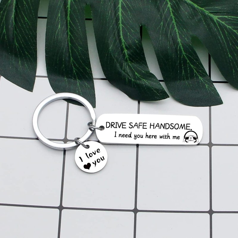 - 🚗Great Engraving & Shinny Polish –Drive Safe I Need You Here With Me/Drive Safe Handsome, I Love You/Ride Safe I Need You Here With Me is engraved on beautiful polished charm tags, good quality.
