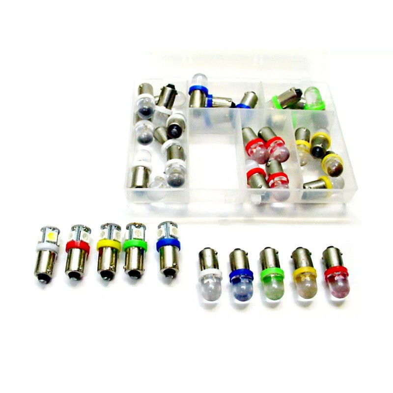 This kit contains (10) White (5) Red (5) Yellow (5) Green (5) Blue dome lights and (5) 5-LED lights, one of each color. Includes heavy duty plastic case.