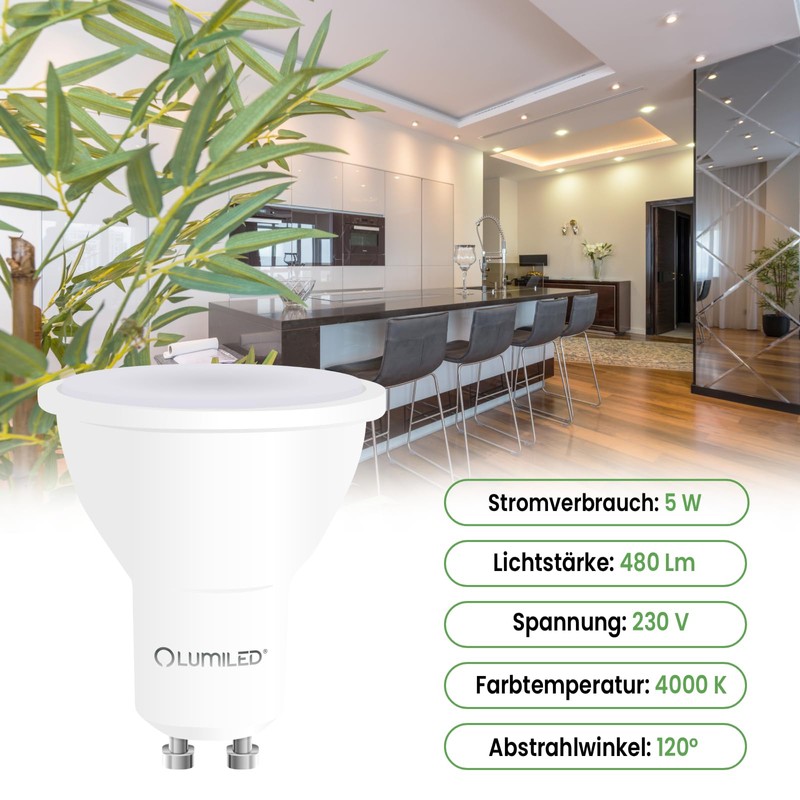 Lumiled GU10 LED, 5 W, 470 lumens, 4000 K, neutral white bulb, spotlight, replaces 35 W halogen bulbs, 120° beam angle, reflector bulbs, pack of 10 energy-saving bulbs