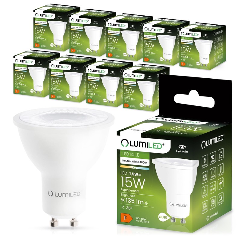 Lumiled LED GU10 Bulb 1.5 W 135 lm Neutral White 4000 K Replaces 15 W Halogen CRI>80 Reflector Spot 36° Beam Angle Not Dimmable Pack of 10 Energy-Saving Bulbs for Living Room Kitchen Hallway Hotel