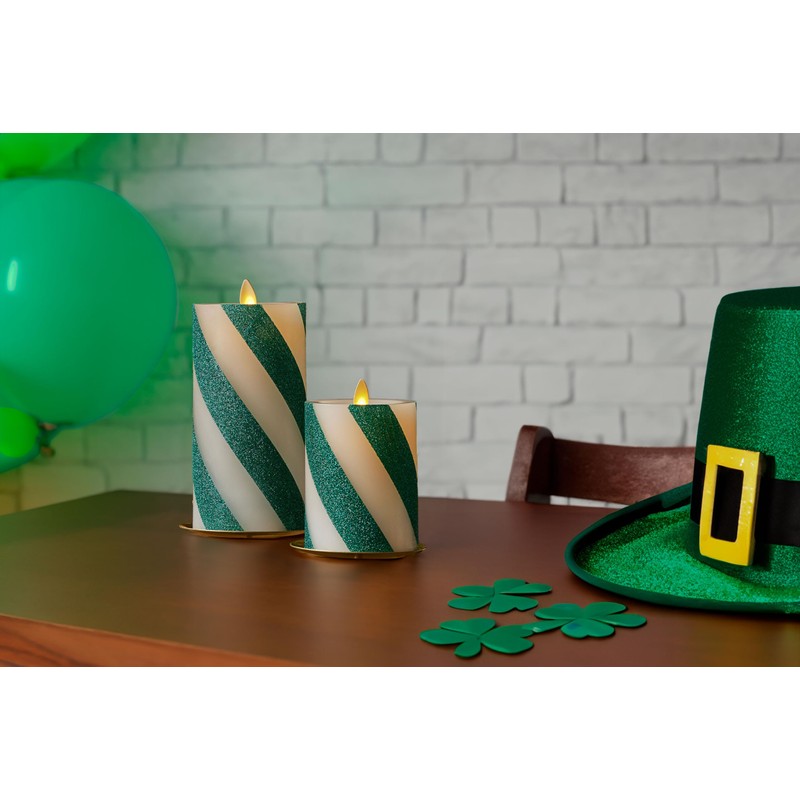 - A holiday twist on a classic, these candy cane pillars sparkle with green glitter swirls instead of red for a complementary evergreen touch that is equally as festive. With two sizes available, these green glitter swirl candy cane pillars look great grouped together, but still set a merry mood when used individually for a worry-free glow amongst other seasonal holiday décor.