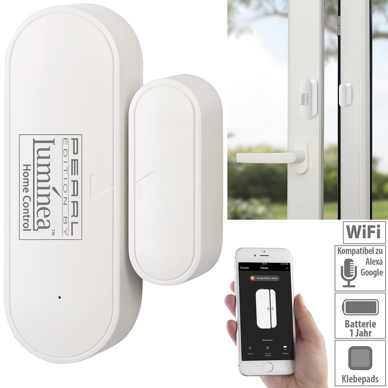 Luminea Home Control WLAN Fensterkontakt: 5er-Set WLAN-Tür- & Fensteralarm mit App, für Alexa & Google Assistant (Tür Fenster Kontakt, Türalarm Fensteralarm Smart-Home, Senioren Handy)