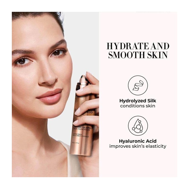 - Silk Airbrush Foundation: The Spray Silk Foundation contains hydrolyzed silk, which refracts light across the skin. This helps soften the look of lines, wrinkles, and rough texture to create a smoother, younger-looking appearance. The formula also includes a blend of anti-aging ingredients including Vitamin A and Vitamin C and hydrating ingredients that draw moisture in and soothe the skin, ensuring your makeup lasts all day with minimal touch-ups.