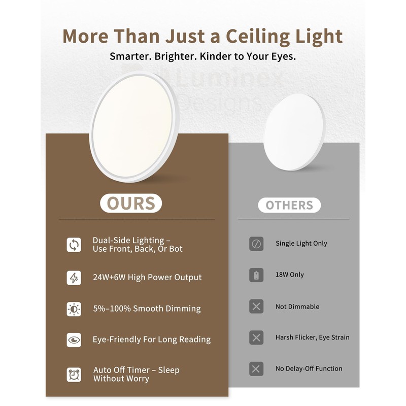 • Reliable and energy-saving: with 24 W + 6 W power, 2400 lumens brightness and a service life of 30,000 hours, you not only save energy, but also long-term costs. No flicker, no glare - safe for eyes and ideal for everyday use. 2 year warranty included!