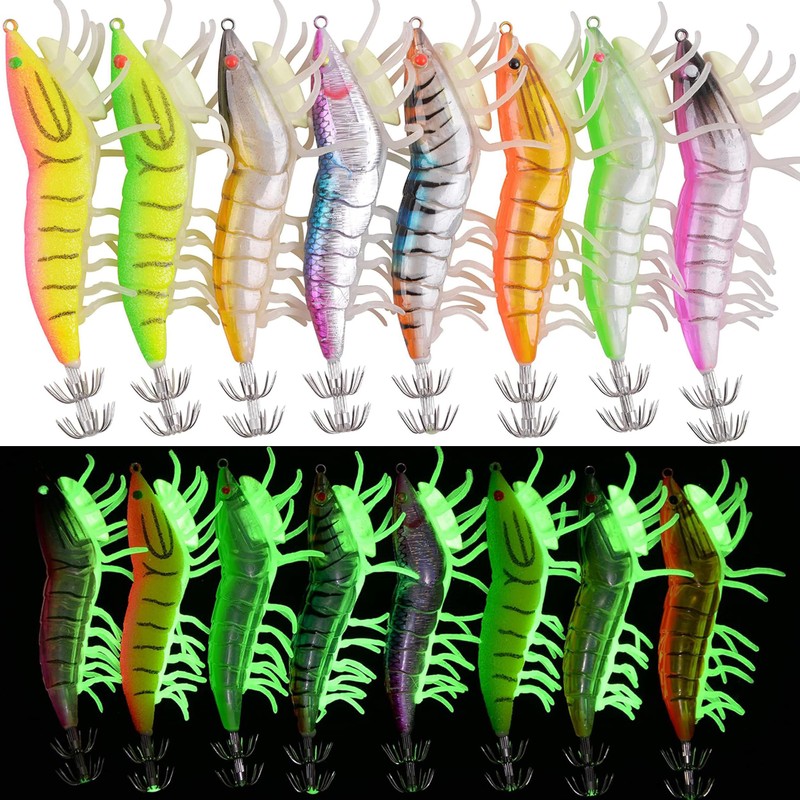 Luminous Squid Jig Hooks Shrimps Lure Saltwater Fishing Lures Octopus Cuttlefish Glow Body Shrimps Prawn Stainless Steel Squid Jig Fishing Hooks 8pcs