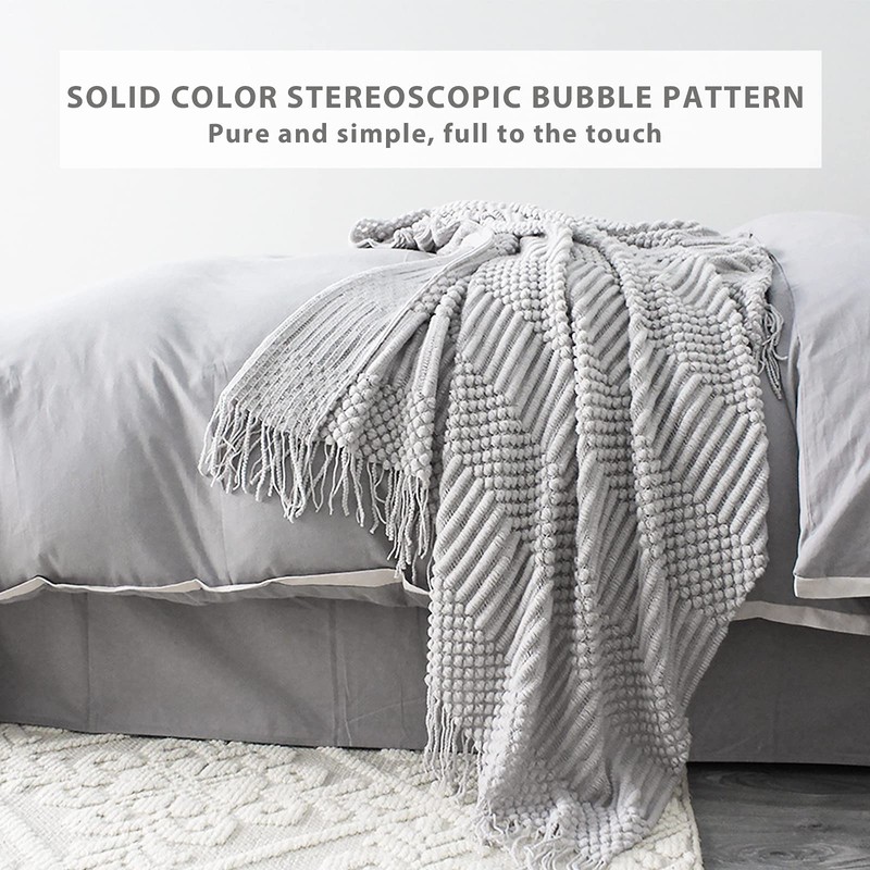 - Exquisite design: knitted blanket with cashmere texture. Stereoscopic bubbles, fluffy and soft to the touch, simple yet full design. The classic tassel hem and the creative change of large and small braided tassels make the overall line of the blanket smoother, more practical and exquisite. A variety of colours meets your different decoration needs.