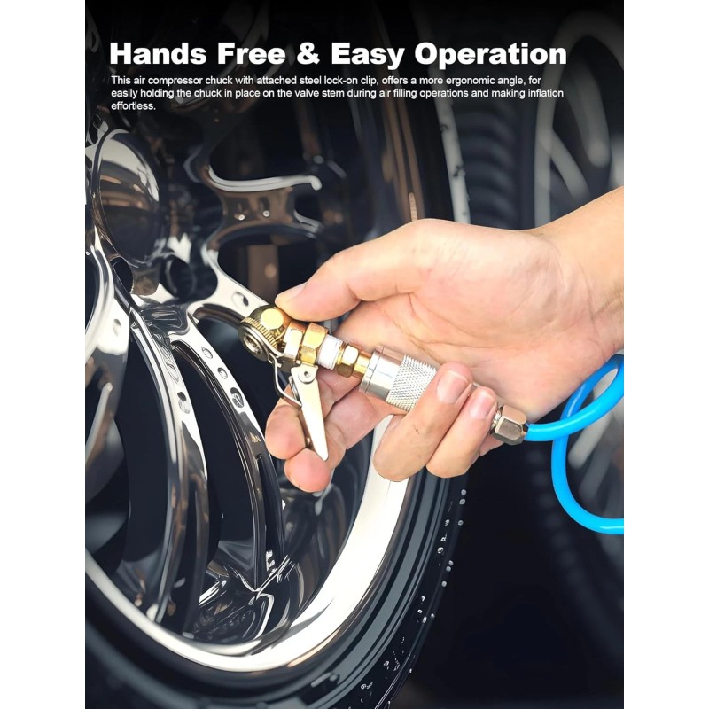 - 【Hands Free & Easy Operation】: This air compressor chuck with attached steel lock-on clip, offers a more ergonomic angle, for easily holding the chuck in place on the valve stem during air filling operations and making inflation effortless.