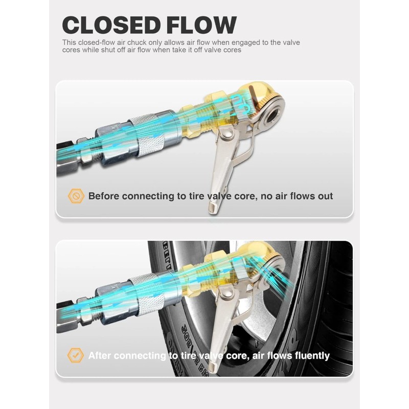 - 【Closed Flow Air Chuck】: This lock on air chuck built in shut-off valve, air only passed through when the air chuck is engaged with a tire valve. Maximum to 160 PSI air pressure, press to inflation easily and quickly, which is a perfect choice no matter for industrial or household use.