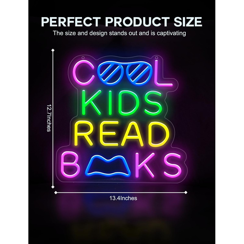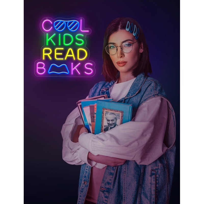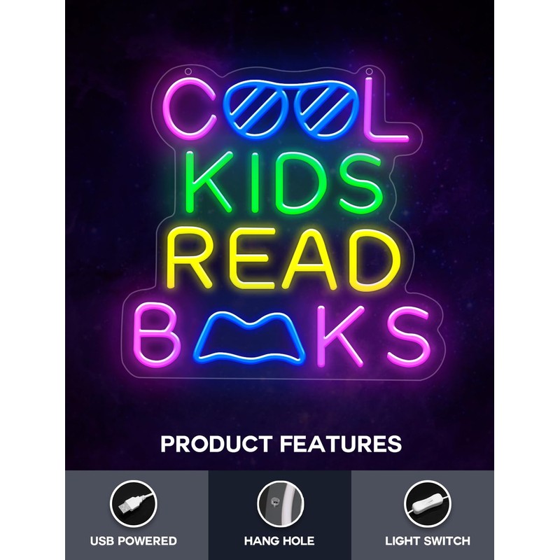 - Cool Kids Read Books Neon Sign: The "Cool Kids Read Books" neon sign makes reading exciting and meaningful for children! Its vibrant pink, blue, green, and yellow lights captivate young minds, inspiring a love for books while adding a playful and stylish touch to any study room, bedroom, playroom, dorm, or library. This eye-catching decor transforms spaces into beautifully lit, inviting havens for young readers.