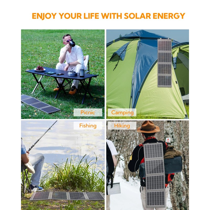 - 23.5% High Efficiency & IP65 Water Resistance - Made from premium monocrystalline silicon, this 40W foldable solar charger boasts a high conversion efficiency of up to 23.5%, effectively converting solar energy into electrical power. The ETFE laminated surface ensures higher durability and resistance to wear and dirt compared to PET solar panels. Coupled with waterproof nylon fabric and waterproof zippers, it's a reliable partner for outdoor hiking, camping, RV trips and backpacking.