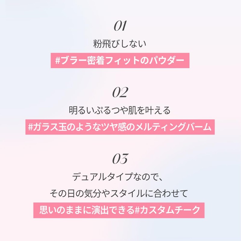 - Dual Texture: Smooth powder and moist glow balm in one palette, giving you the freedom of gradation and dimensional feeling