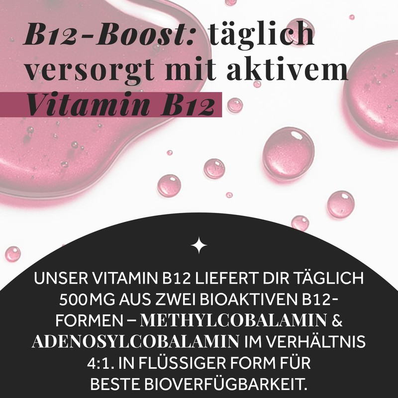 - 2 active B12 forms: 500 μg vitamin B12 per drop - high dose in bioactive combination of methylcobalamin and adenosylcobalamin in a ratio of 4:1.