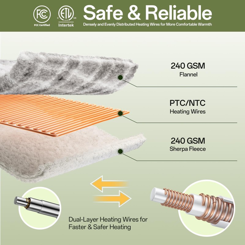 - Safety First: This electric blanket full size(72" x 84") is ETL and FCC certified after passing rigorous UL testing, ensuring it meets international safety standards. Designed with low electromagnetic radiation, this heated blanket provides a safer and more reliable heating experience for you and your family.