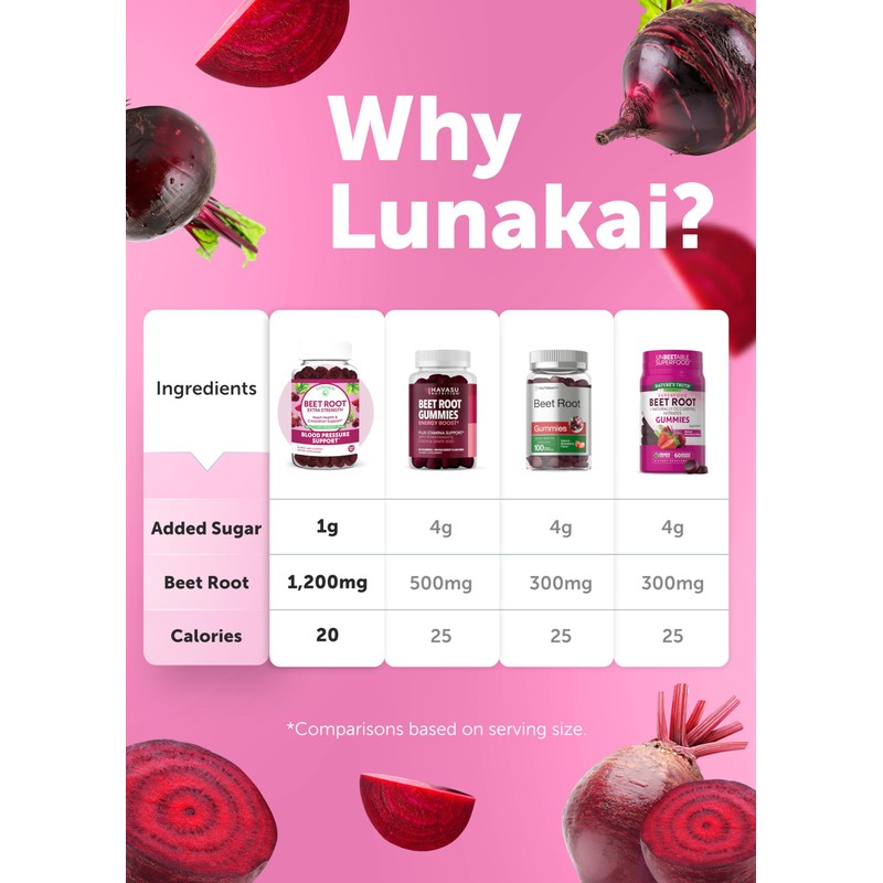Lunakai USA Made Beet Root Gummies with Antioxidant Blend - Delicious Non-GMO Beet Chews, 60ct