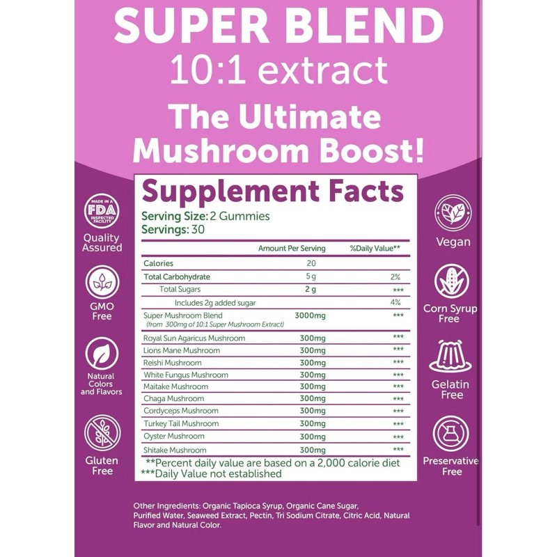 Lunakai Super Mushroom 60 Gummies 3000 mg Blend Reishi Cordyceps Chaga