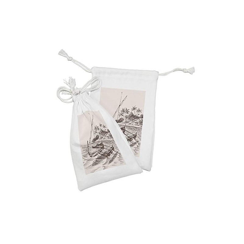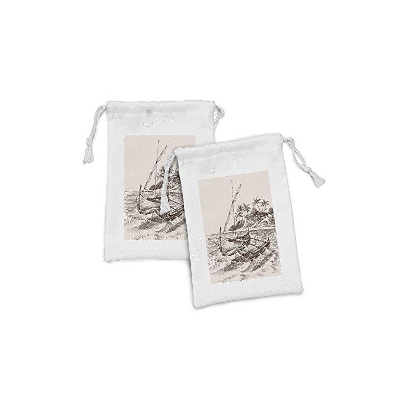 Lunarable Boat Fabric Pouch Set of 2, Detailed Hand Drawing Sketch of Fishing Dinghy Sails and a Canoe on a Shore, Small Drawstring Bag for Toiletries Masks and Favors, 9" x 6", Champagne Chocolate