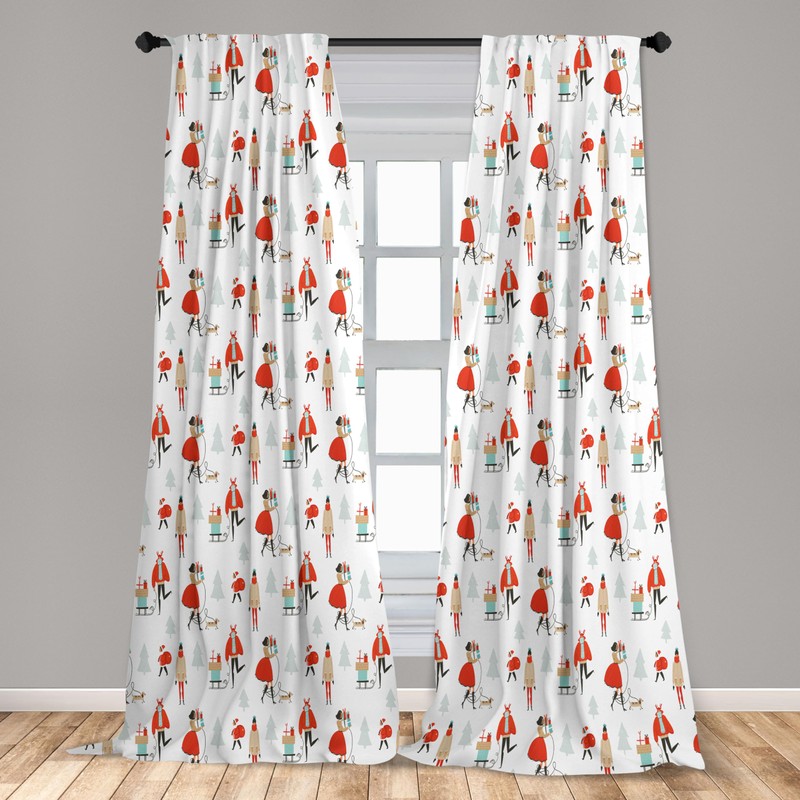 Lunarable Christmas Window Curtains, Holiday Theme with People Carrying Presents, Lightweight Decor 2-Panel Set with Rod Pocket, Pair of - 28" x 84", Seafoam Vermillion